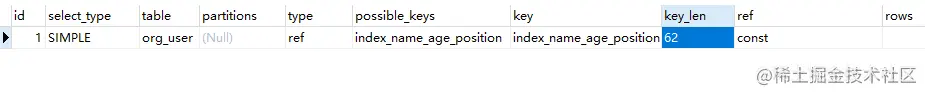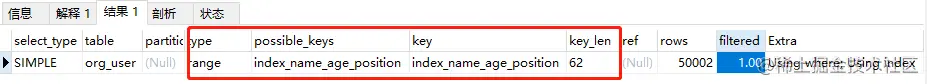 可以看出来上面的sql走的索引(其中name字段长度20,所以name索引的key_len = 62),通过key_len 可以看出以上sql,使用了联合索引中的name