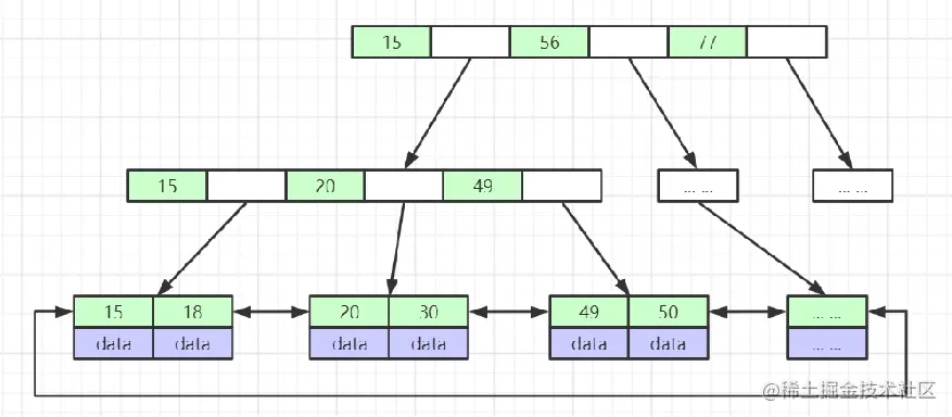 - 叶子节点用指针连接,提高区间访问的性能 图示: