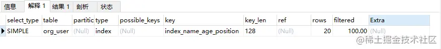 | 5 | where age = xx 或者 where age = xx and position = 'xx' 或者 where position = 'xxx' | 没有使用索引 |