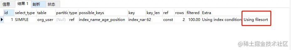 - 如果order by的条件不在索引列上,就会产生Using filesort.