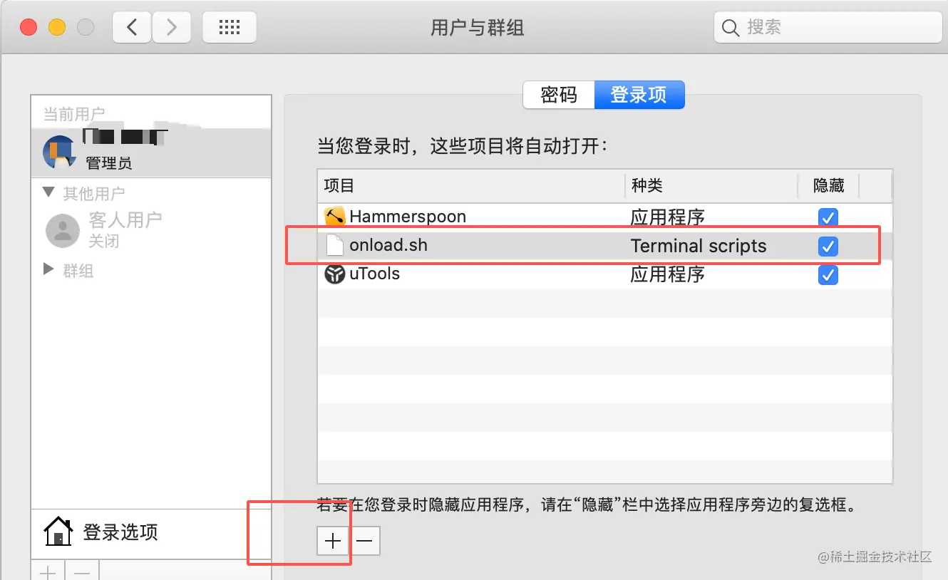 3. 写好后打开系统偏好设置 -> 用户与群组 -> 登陆项 -> 点击加号把脚本添加进来