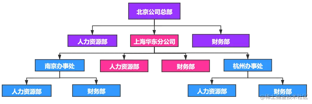 北京总公司就好比这个根节点,其下属分公司也就是这棵树的分支,像办事处就是更小的分支,无论是总公司还是分公司,亦或办事处的相关职能部门(如财务部)都没有分支了,所以也就是叶子节点