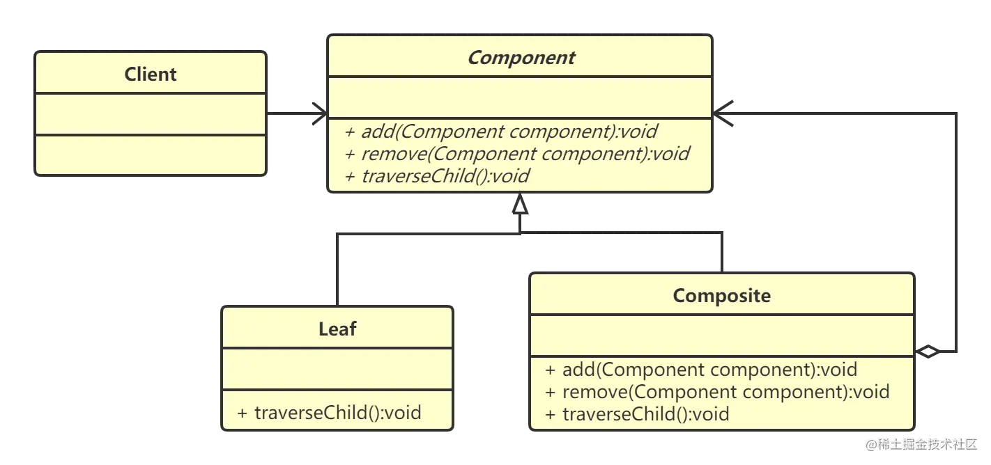 在上面的代码中,我们在抽象的 Component 中定义了 add 和 remove 方法