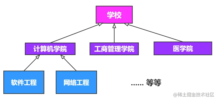 如果我们按照最简单能想到的方式,或许就是多层继承,例如 XXX大学,下面计算机学院等多个学院去继承 XXX 大学,而软件工程,计算机科学与技术等专业又去继承了计算机学院