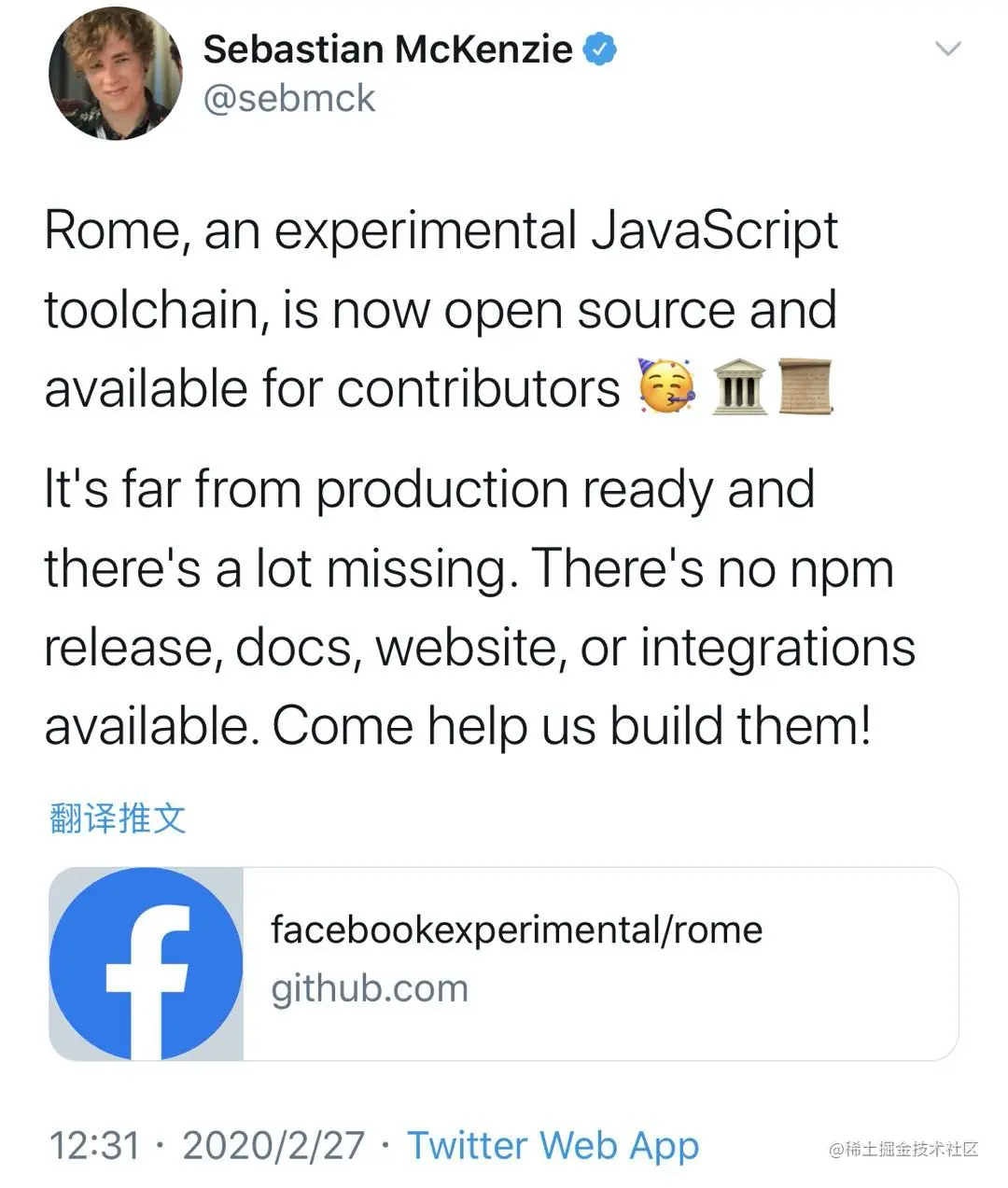 北京时间 2020 年 2 月 27 日,Facebook 宣布其实验性 JavaScript 工具链 Rome 开源。Rome 是 Babel 和 Yarn 作者、React Native 团队成员 Sebastian McKenzie 的新作品。开源之前,Rome 基本上 Sebastian McKenzie 的个人项目,只不过 Facebook 愿意付薪水让他潜心开发。
