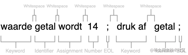 tokenizer将源代码分割成token。从技术上讲,一个定义的regex匹配一串源代码,并被映射到一个标记。这意味着源代码和标记列表之间存在着一对一的映射。例如,考虑以下源代码。"waarde getal wordt 14; druk af getal;"(在英文伪代码中,它将被翻译成 "val number = 14; print number;")。这条语句被分解成13个不同的部分。