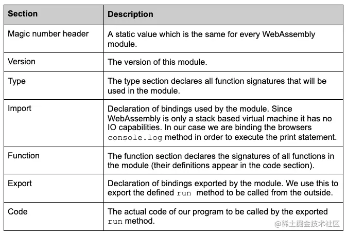 发射器将AST转化为一个字节数组;一个WebAssembly实例可以理解的模块。在代码部分旁边,这个字节数组包含了其他部分,使其成为一个有效的WebAssembly模块。虽然这篇博客不是关于WebAssembly的,但为了完整起见,我们将列出这些部分。