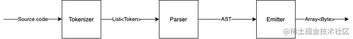 在高层次上,我们的编译器由3个不同的组件组成。tokenizer, parser, 和 emitter.