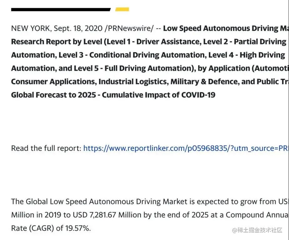 2020年9月18日雅虎财经发布了《新冠疫情影响下,全球低速自动驾驶市场研究报告》的引文,该研究报告由法国知名市场调研公司ReportLinker深度制作。