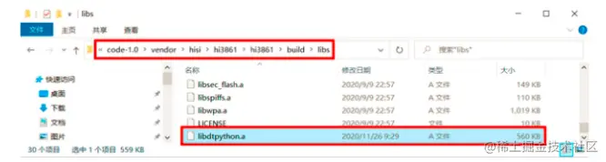 1、下载文末附件中的 libdtpython.a,并将其拷贝到 \code-1.0\vendor\hisi\hi3861\hi3861\build\libs 目录下,如图:
