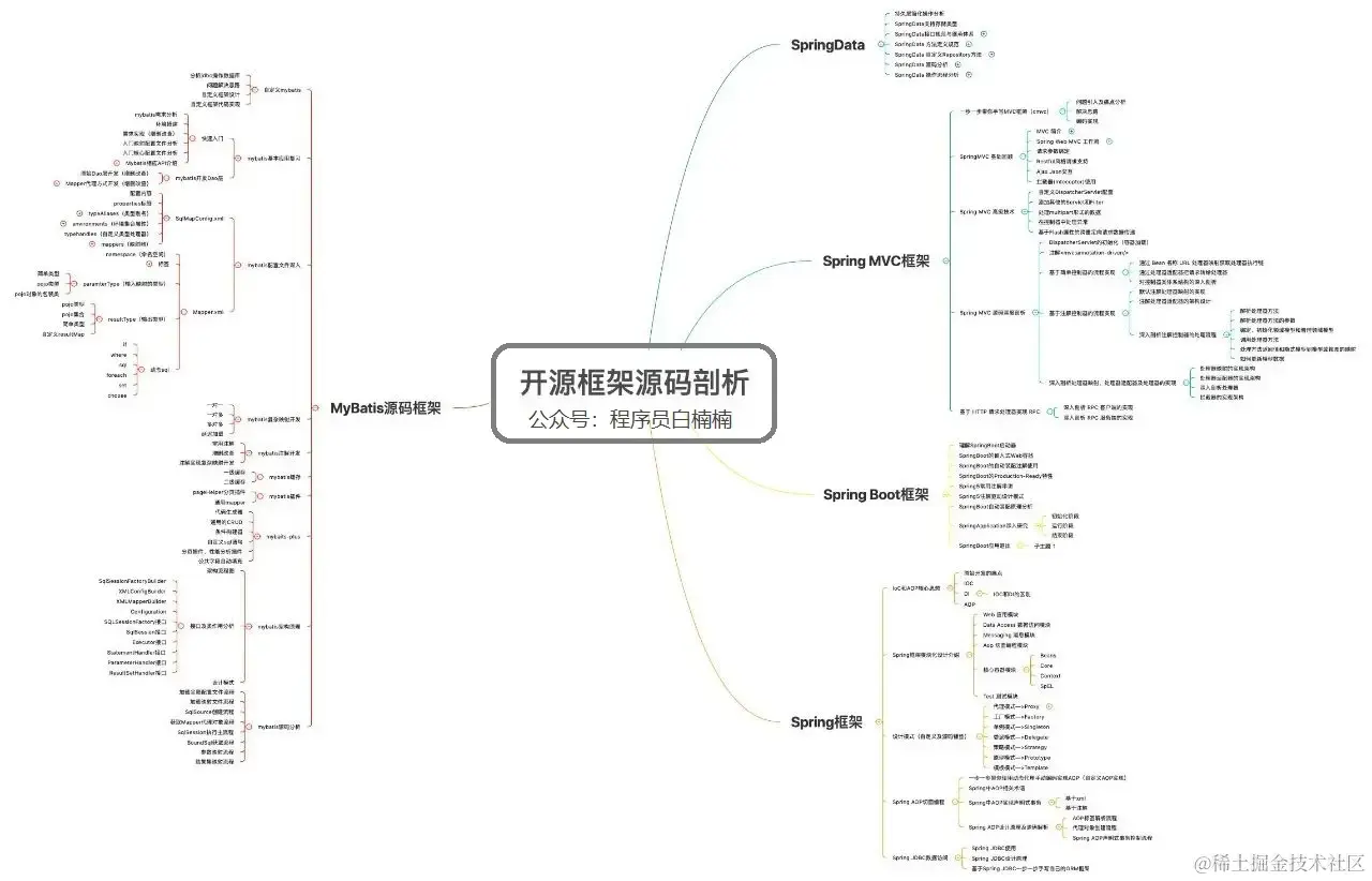 想给大家看一张图「开源框架学习知识图」,包含了 Java 工程师一定要花时间学会的四大开源框架--MyBatis、Spring、Spring MVC、Spring Boot,清晰了解学习每个框架所需要的知识点。(ps:有兴趣的可以直接拉到文章末尾,领取高清版图谱)