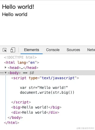 String对象的方法big: 用于把字符串显示为大号字体- 方法同上(此处简略说明):