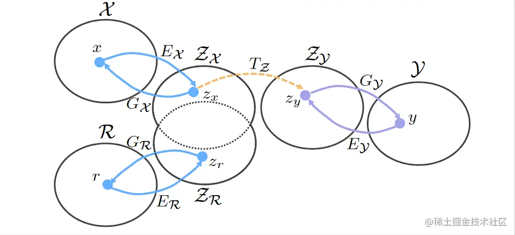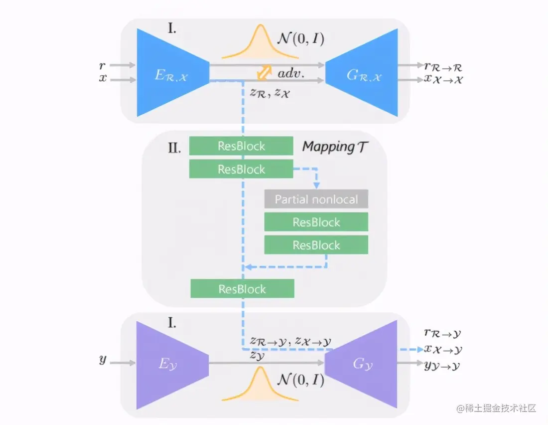 由于老照片和合成数据已经在隐空间进行了很好的域对齐,因此,通过成对数据{x, y}学到的从隐编码Z_X到隐编码Z_Y的映射,也能够很好的泛化到老照片上。在这一阶段,那就是固定两个VAE,然后学两个隐空间的映射网络T,