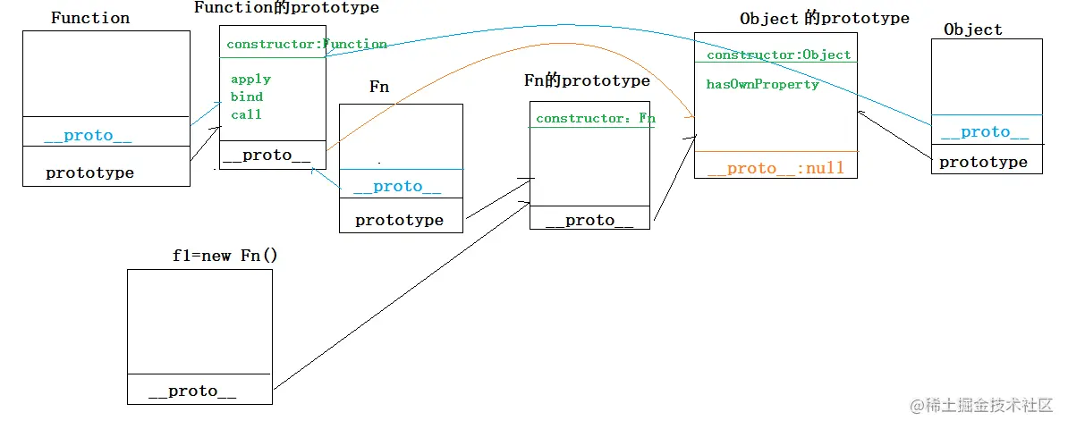 __proto__属性,指向所属类的原型 Object基类也是一个函数,所以Object.__proto__也指向Function.prototype- 函数的实例有