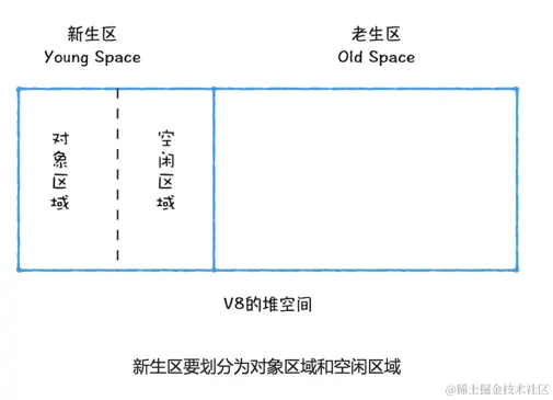 所以,在V8中会把堆分为新生代和老生代两个区域,新生代中存放的是生存时间短的对象,老生代中存放的是生存时间久的对象。
