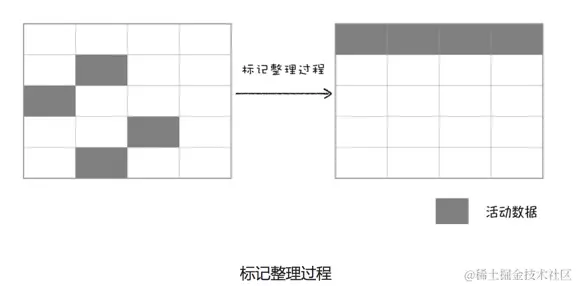 上面的标记过程和清除过程就是标记-清除算法。不过对一块内存多次执行标记-清除算法后,会产生大量不连续的内存碎片。而碎片过多会导致大对象无法分配到足够的连续内存,因此有了标记-整理,标记的过程和上面一样,而整理是让所有存活的对象都向一端移动,然后直接清理掉段边界意外的内存。