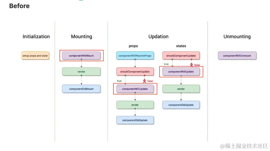 - 取消UNSAFE_componentWillReceiveProps(preProps, preState) ,UNSAFE_componentWillUpdate(nextProps, nextState)原因: 这两个生命周期都在reconciliation过程中 在异步模式下,reconciliation会被打断,所以可能触发多次 如果在这两个生命周期做一些fetch请求、props的回调等产生副作用的事情,那么可能会导致执行多次