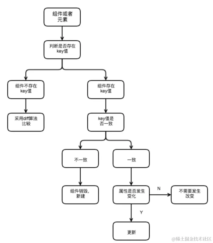 - key是一个组件、节点的身份标识,在rerender时,可以通过key来判断该组件是否已经存在,是否需要跟新或者销毁,新建等操作,提高了diff算法在同级节点上的操作。