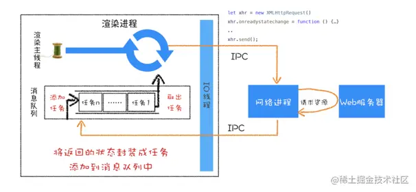 对比上一篇,setTimeout 是直接将延迟任务添加到延迟队列中,而XMLHttpRequest 发起请求,是由浏览器的其他进程或者线程去执行,然后再将执行结果利用 IPC 的方式通知渲染进程,之后渲染进程再将对应的消息添加到消息队列中