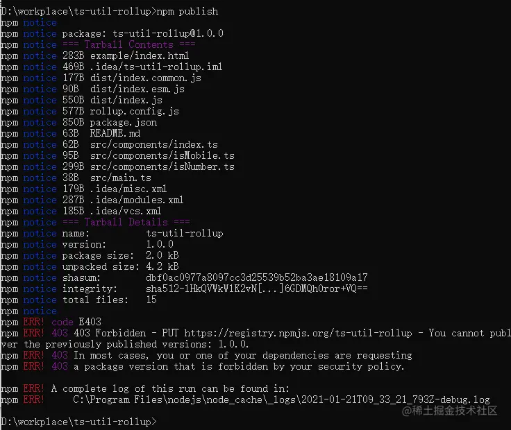npm publish发布 注意这里要用npm官方源,不能用淘宝源会输出一堆信息,我这里提示因为版本被拒绝了,因为我已经提交过1.0.0的版本,也就是说