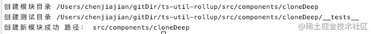 const fs = require('fs') const path = require('path') const readline = require('readline') // 终止 const exit = function (log) { console.error(log) process.exit(1) } // 模块路径 const MODULES_PATH = path.join(__dirname, '../src/components') // 模块名称 const MODULES = process.argv[2] if (!MODULES) { exit('请填入模块名称') } // 输出路径 const OUT_PATH = path.join(MODULES_PATH, MODULES) // 文件路径 const TEST_OUT_PATH = path.join(OUT_PATH, '__tests__') // 测试用例文件路径 const isExists = fs.existsSync(OUT_PATH) if (isExists) { exit(`${MODULES}目录已经存在`) } fs.mkdirSync(OUT_PATH) console.log('创建模块目录', OUT_PATH) fs.mkdirSync(TEST_OUT_PATH) console.log('创建测试目录', TEST_OUT_PATH) // 函数模版 const addFileTemp = ` export default function ${MODULES} (val:any) { return val } ` // 测试用例模版 const testTemp = ` import ${MODULES} from '../index' describe('${MODULES}', () => { it('结果通过啦', () => { expect(${MODULES}('a')).toBe('a') }) }) ` // 文件路径 const FILE_PATH = path.join(OUT_PATH, `/index.ts`) const TEST_PATH = path.join(TEST_OUT_PATH, `${MODULES}.test.ts`) // 写入文件 fs.writeFileSync(FILE_PATH, addFileTemp) fs.writeFileSync(TEST_PATH, testTemp) console.log('创建新模块成功', `路径: src/components/${MODULES}`)可以看出这个文件其实就是,通过我们输入的函数名称,在文件夹