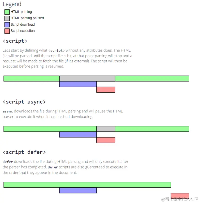 注: 如果不设置这两个属性,则会同步加载执行,阻塞后面的渲染,如果设置了async,则加载和 渲染 后续文档元素的过程和js脚本的加载执行并行进行(异步)。如果设置了defer,则加载后续文档元素的过程和js脚本的加载执行并行进行(异步),但是脚本执行要在所有元素解析完成后,DOMContentLoaded事件触发之前完成。如图:benngbung同步