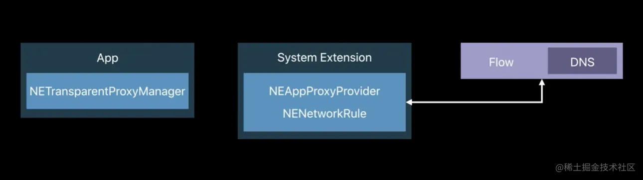 系统扩展支持NEAppProxyProvider子类来代理传输层的流量,并且需要通过NENetworkRule指定代理规则,才可以将流量转移到NEAppProxyProvider类中。这样TCP/UDP数据流打开后会根据上面设置的匹配规则,来转移数据流至NEAppProxyProvider类中,具体的数据流处理由NEAppProxyProvider类来决定