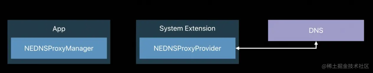 DNS代理允许你的应用拦截设备上生成的所有DNS流量,你可以使用此功能提供DNS流量加密等服务,通常是将DNS流量重定向到你自己的服务器。你通常在托管设备的上下文中执行此操作。控制应用通过NEDNSproxyManager来创建DNS代理配置并在系统中配置,来运行系统扩展。系统扩展创建NEDNSProxyProvider子类来处理所有DNS查询流量。