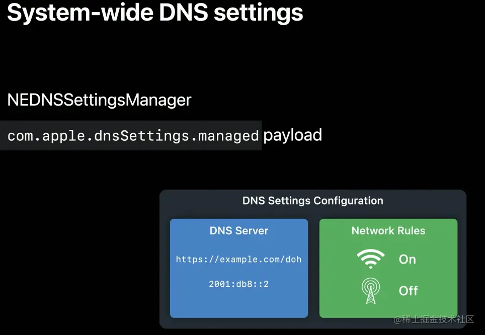 NEDNSOverHTTPSSetting来配置DNS服务器,即配置dnsSettings属性; - 调用