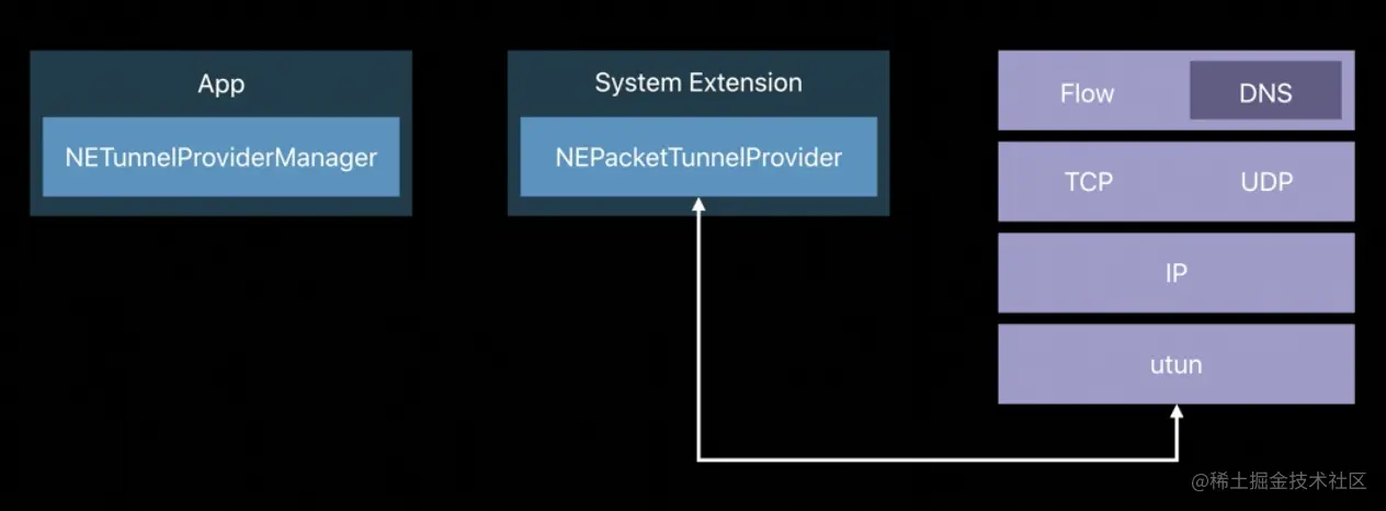 数据包隧道的形式主要通过NEPacketTunnelNetworkSettings,该类具体是配置虚拟网卡的过滤的IP地址。因为是在网络层过滤,因此只能配置IP地址而不能配置端口。而App代理是作用于传输层因此可以指定过滤的端口,但对于过滤所有的DNS查询存在限制。若需要过滤DNS查询,MacOSX10.15+支持的DNS代理就可以过滤所有DNS查询数据包,且不用关心具体的本地的DNS服务器地址,因其自动判定过滤所有的DNS服务器的DNS查询数据包。