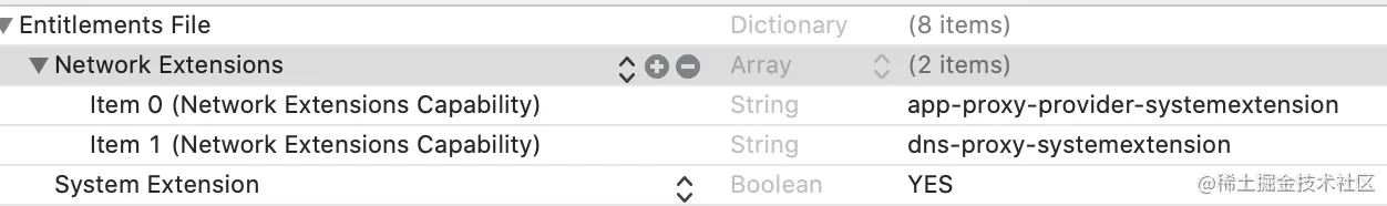 Capability中添加System Extension,对于开发网络扩展的则需要开启Network Extension,网络扩展中的权利则不需要指定,由工程中的.entitlements文件来指定,比如开发App或者DNS代理,指定如下: