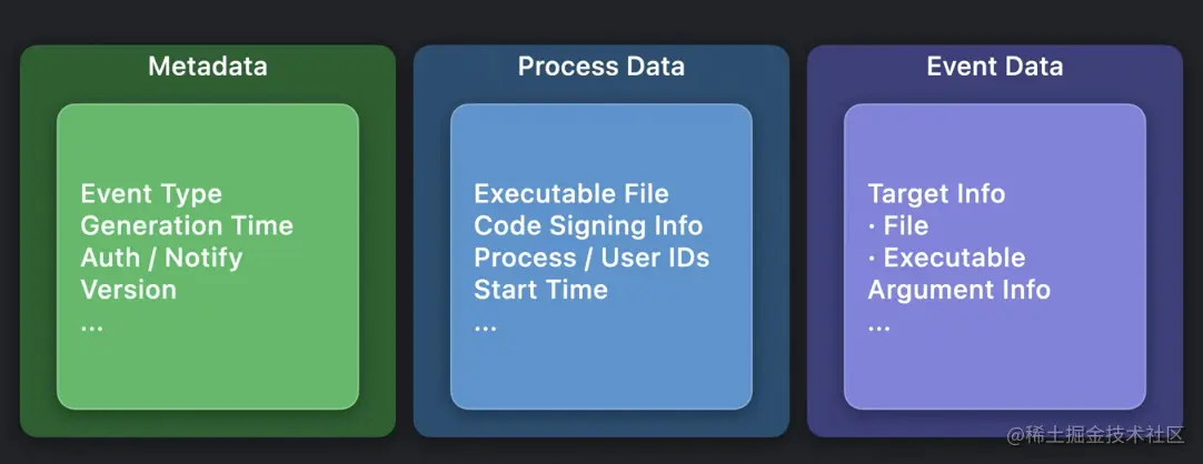 - 进程信息,比如可执行文件的信息、例如完整文件状态信息,还有代码签名、进程及用户ID等信息;