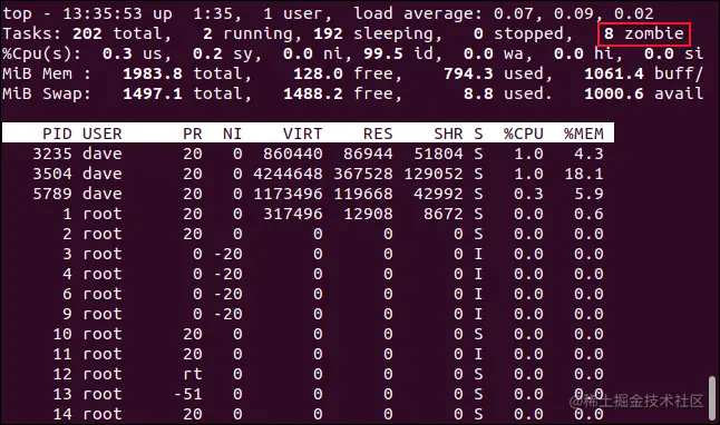 该init进程定期执行必要的清理僵尸的操作,因此要杀死它们,您只需杀死创建它们的进程即可。 该top命令是查看是否有僵尸的便捷方法。