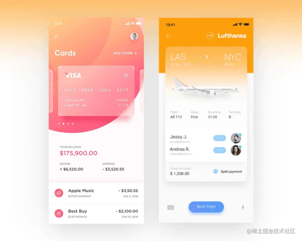 **特点:**轻量渐变是一种简约且高度可用的元素,可创造出一些时尚的氛围,同时不会有信息过载的担忧,这使得轻量渐变成为一种