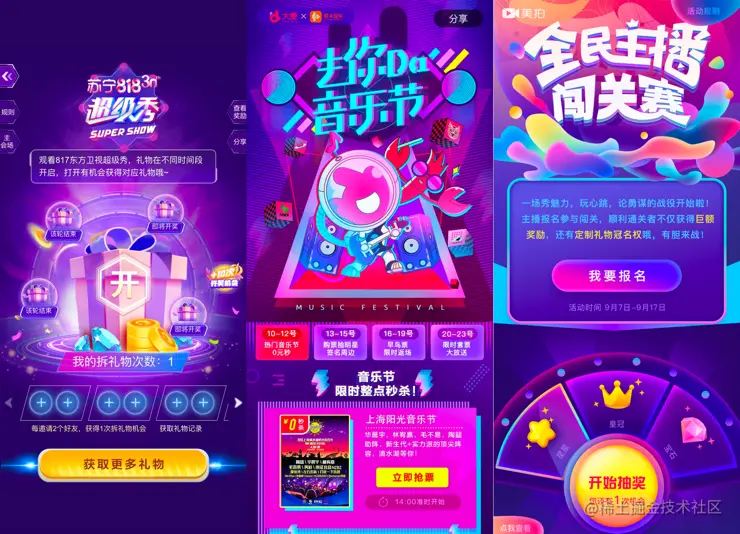 偏暗色调的霓虹渐变色背景烘托出专题页的内容主体,使得页面运营氛围更好同时在一些重要的、需要用户操作点击的部分使用了暖色调的霓虹色渐变,使得内容主体在冷色调的环境下更为突出,提高了用户体验。