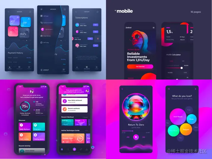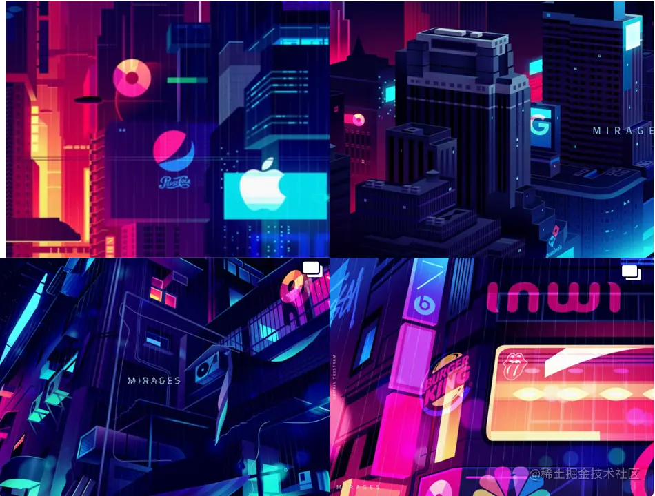 霓虹色渐变在暗色调的背景烘托下,撞色的冲击感使得画面更加具有科技感、潮流感;对于霓虹色渐变使用比较频繁的赛博朋克风、故障风,也是现下较为前沿的风格,通过丰富鲜明的色彩与背景作强对比,营造出极具视觉冲击力的画面效果;霓虹渐变色也被广泛的使用于app、web、插画等领域,但其大胆、强烈的配色风格给画面带来的冲击感以及潮流、自由感,使得它仍然成为当下一种比较流行的色彩趋势。