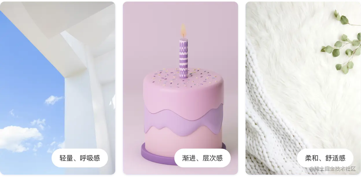 为轻量、柔和、层次递进,营造一种舒缓、治愈的沉浸感。特点为渐变色彩邻近,幅度轻柔,节奏缓慢,融合感和细腻感较强。