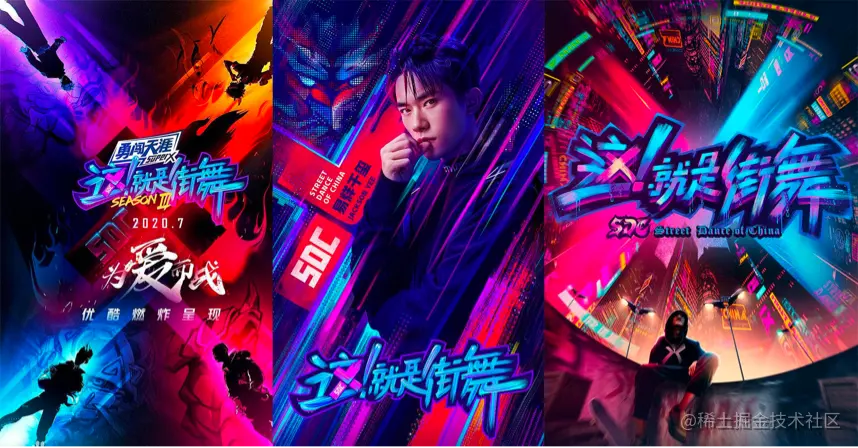 通过大面积的霓虹色渐变结合迷彩渐变的绘制手法,构建不同色彩鲜明的矩形图案,暗色调的背景烘托与颜色用冷色为主暖色为辅、点缀,画面感极强,极具视觉冲击力。