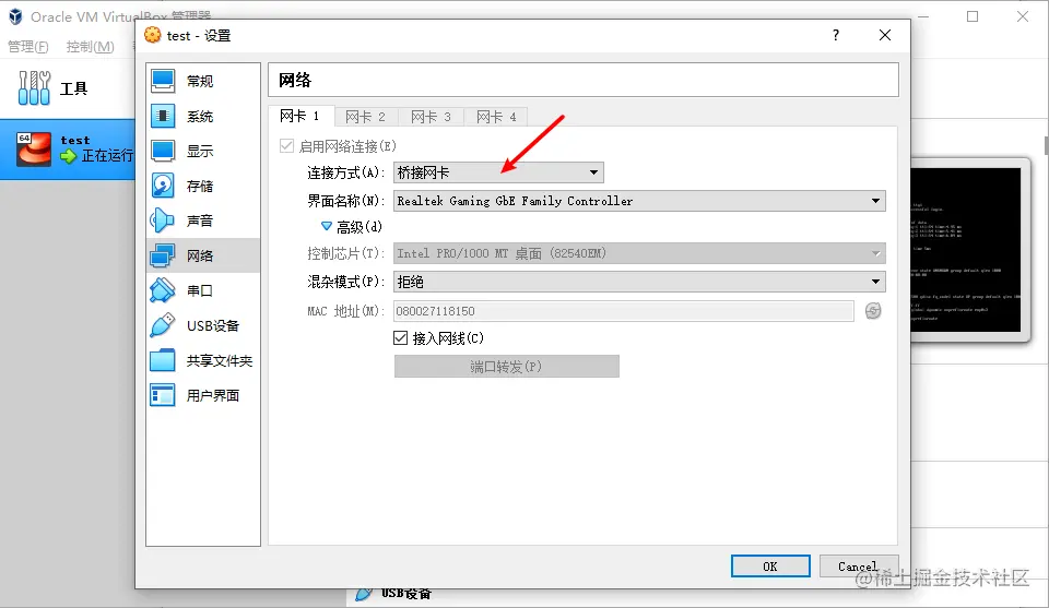 打开 VirtualBox 的设置,再点击网络,连接方式选桥接网卡。