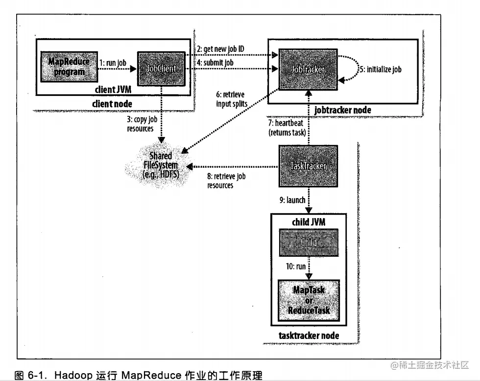 可以只用一行代码来运行一个MapReduce作业:JobClient.runJob(conf)。这个简短的代码,幕后隐藏着大量的处理细节。本章将揭示Hadoop运行作业时所采取的措施。