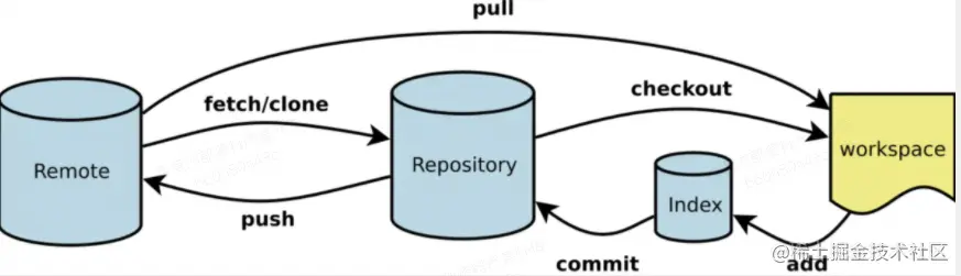 - 工作区(workspace):进行开发改动的地方,是当前看到的,也是最新的。平常我们开发就是拷贝远程仓库中的一个分支,基于该分支进行开发,该开发过程中就是对工作区的操作。