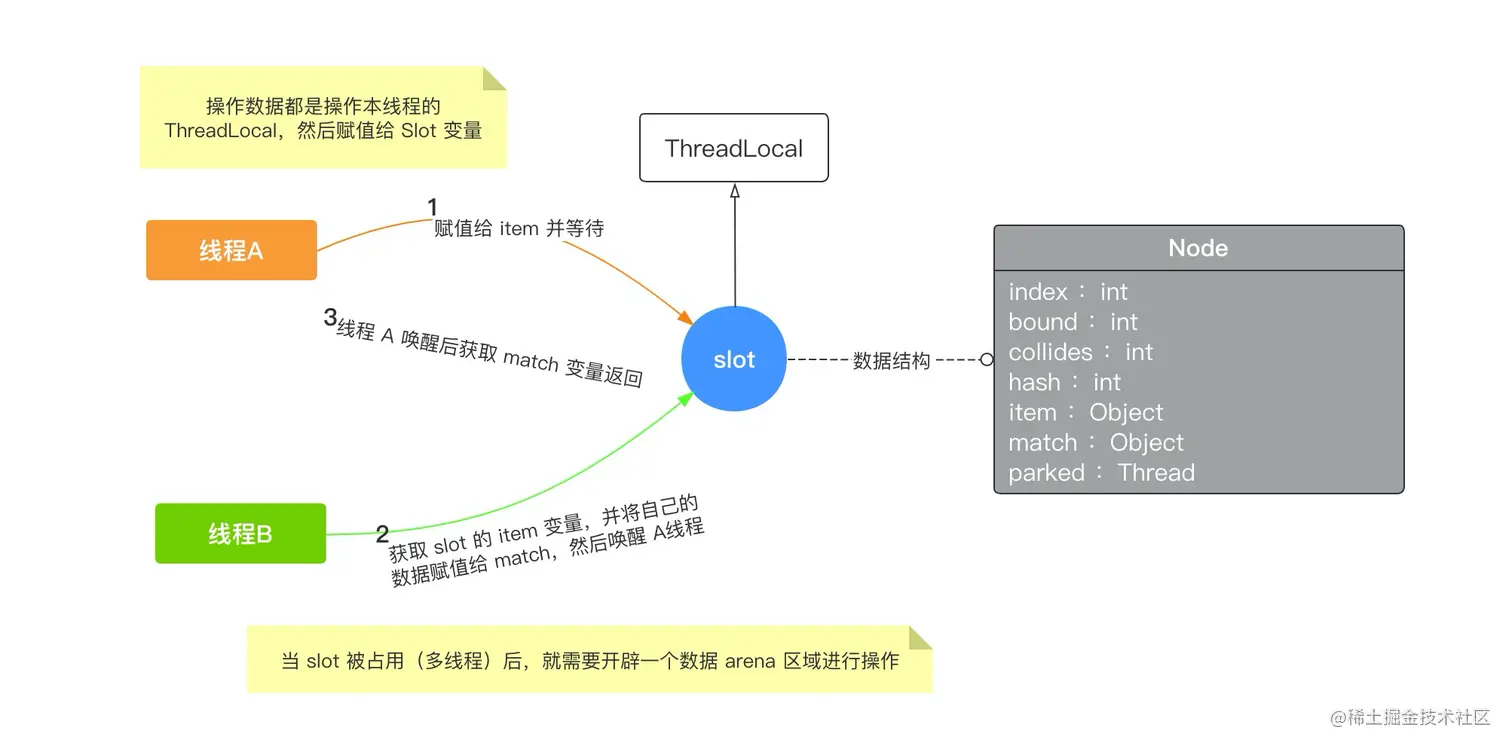 - Exchange 使用了对象池的技术,将对象保存在 ThreadLocal 中,这个对象(Node)封装了数据项,线程对象等关键数据;