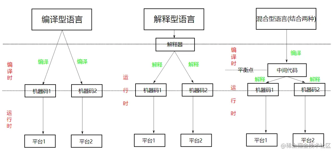 再来看一下Java, Java是解释型语言, 当然更确切的说法是Java是(混合编译的)解释型语言, class字节码是Java语言的中间代码, 运行于JVM上. 和Qt不同, JVM在不同操作系统上向上暴露的接口是基本相同的, 而Java转换成的class字节码在运行时还是需要根据平台的不同而解释运行的.