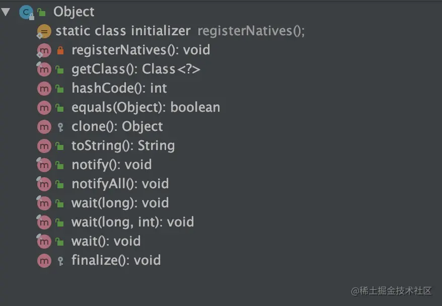 可以看到一共12个方法,其中 registerNatives() 是 native 修饰的,一个本地方法,具体是用C(C++)在DLL中实现的,然后通过JNI调用。