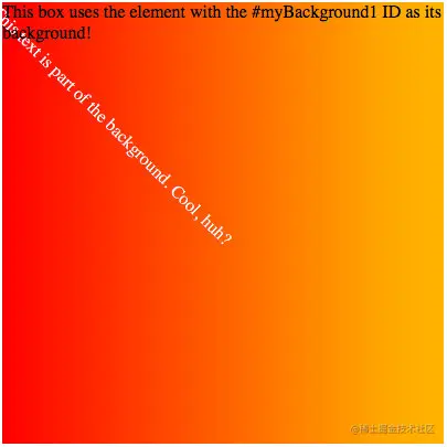这里借用了 MDN 中的一个例子,但是可以十分清晰的了解,通过 background:-moz-element(#myBackground1) no-repeat; 第二个 div 元素已经作为第一个 div 元素的背景图片了。