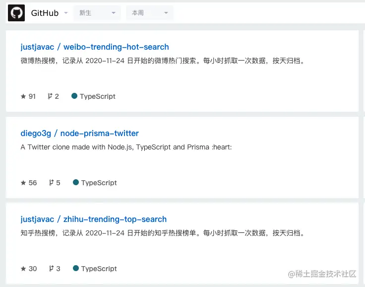 本周,被@justjavac 巨佬的各个热搜榜项目吸睛了,抱着对技术的三分钟热情以及对优秀代码的学习心切,我又开始了新的代码拷贝旅程。二话不说,先