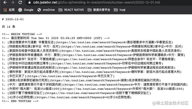 细心的小伙伴也许看到了.md 文件中的注释,就是这注释起到了关键的作用,移花接木?为他人做嫁衣?在进行数据更新的时候,我们可以巧妙地利用注释作为参照,动态替换注释开头和注释结尾中间的内容,利用 Deno 标准库及一些内置 API 完成文件操作,比如今日头条热搜数据的创建及更新: