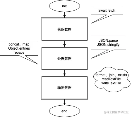 其实抛开语言和平台,要想实现热搜汇总榜,无非就是三步走:① 获取数据 ② 处理数据 ③ 输出数据。接下来从 Deno 的视角来详细解说这三步是如何走的: