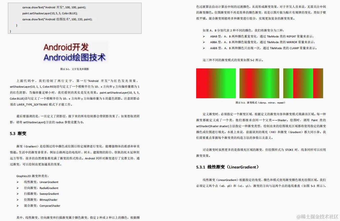 本章将向您介绍阴影、渐变和位图运算等技术。阴影只是一个狭义的说法,实际上也包括发光等效果;Android 也ᨀ供了强大的渐变功能,渐变能为物体带来更真实的质感,比如可以用渐变绘制一颗五子棋或一根金属圆棒;位图运算就更有趣了,Android 为 Bitmap 的运算ᨀ供了多达16 种运算方法,获得的结果也不尽相同。不过,主要还是在于灵活应用