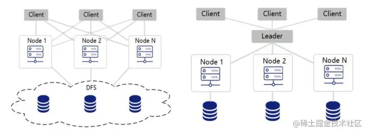DolphinDB架构拥有多个数据节点,但在数据库层面不存在领导节点。每个数据节点虽然拥有本地的存储设备,数据节点与存储是通过DFS进行交互的。